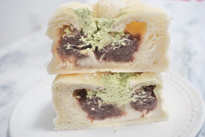 えりも小豆の餡や宇治抹茶入りのホイップ、もっちり食感の求肥がもちもち食感のパン生地で包まれています。抹茶大福が入ってると言っても過言ではないはず!