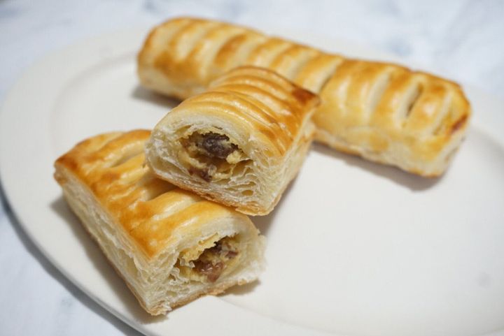 なめらかなカスタード味のクリームと甘みのあるレーズンを包んだ2本入りのパイです。