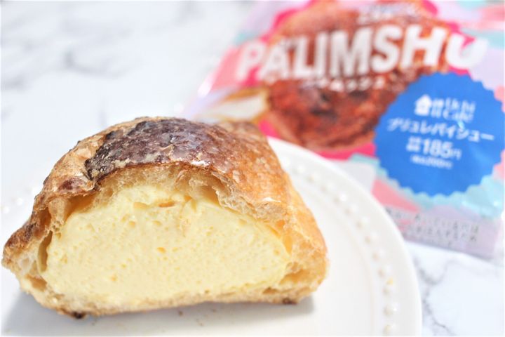 砂糖を焦がしたように焼き上がるパイシートがのったシュー生地に、生クリームと牛乳、卵黄の風味豊かなとろ~り食感のプリンクリームがたっぷりと入っています。