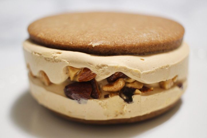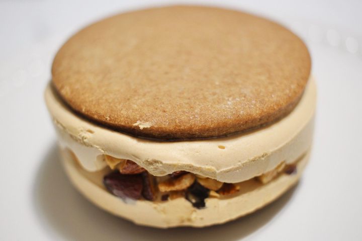 2種類の焦がしキャラメルを使った分厚いキャラメルバタークリームの中にはごろっとしたキャンディングアーモンドが挟まれています。