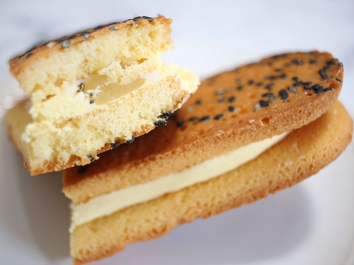 クッキー生地はさっくりしっとりとしていて硬めのフィナンシェのような食感で黒ごまの風味がかなり香ばしい。