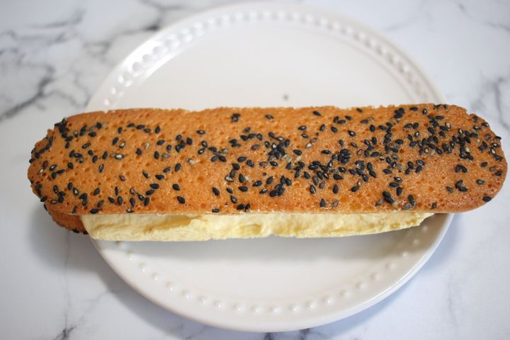 大きくて長いクッキーからは中のクリームがはみでていてたっぷりと入ってることが分かります。
