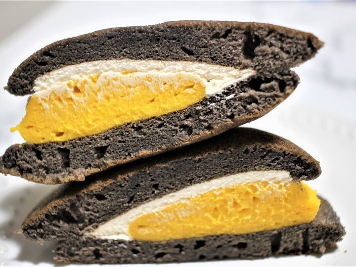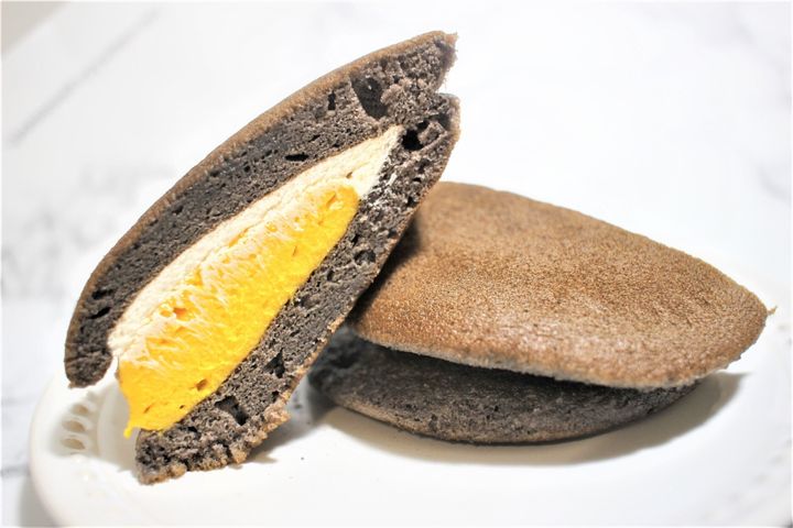 かぼちゃどらはかぼちゃクリームあんとホイップクリームを、ココア生地で挟んだどら焼きです。