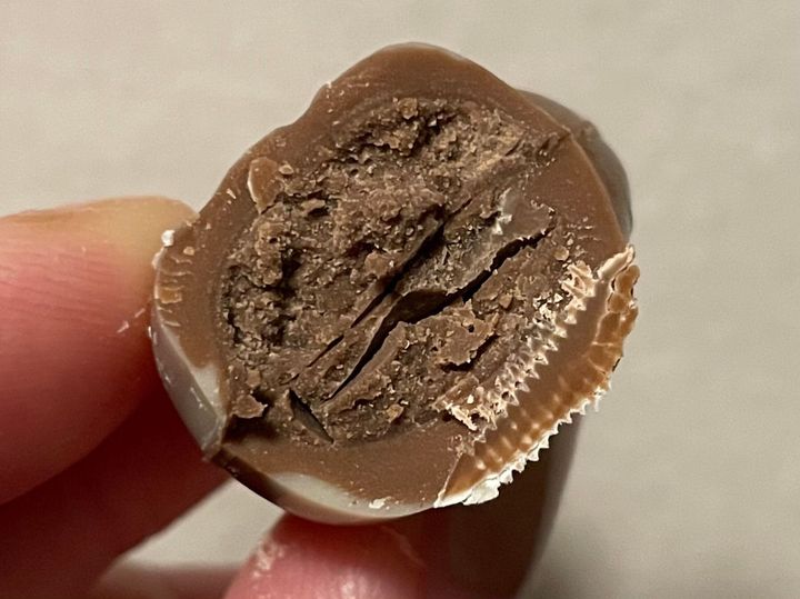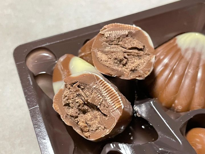 半分に割るとカリッと硬いに甘いチョコの中に、柔らかめのヘーゼルナッツペーストが入っていました。