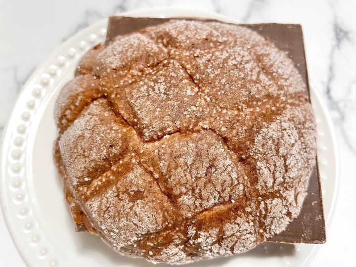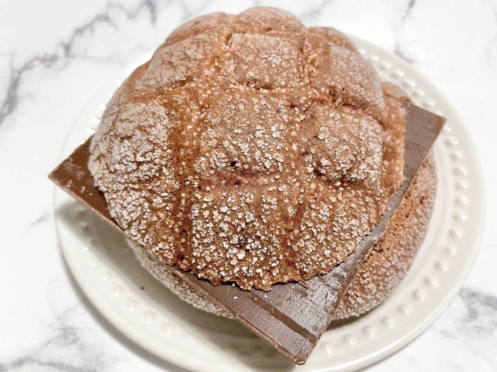 板チョコがチョコ風味のメロンパンからはみでてるのが見えてます。