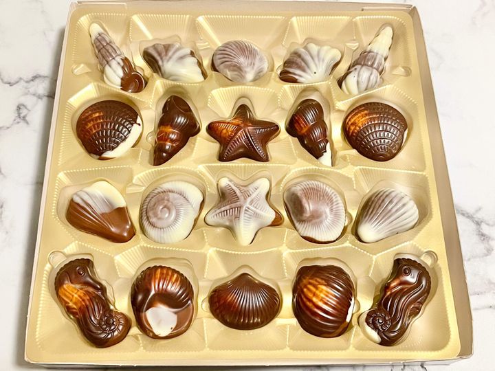 貝殻、、ヒトデ、たつのおとしごなどのシーシェル型チョコが20個も入っています。