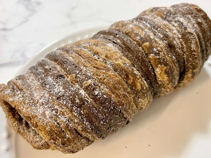 チョコデニッシュ生地とチョコクッキー生地の2種類の生地を使ったチョコデニッシュコロネに、チョコソースや削りチョコ、アーモンドを混ぜたチョコホイップが入っています。