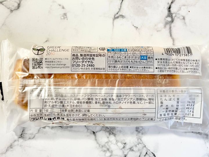 1個あたり369Kcalとカスタードクリームとチョコチップが入ってるため、なかなかお高めです。