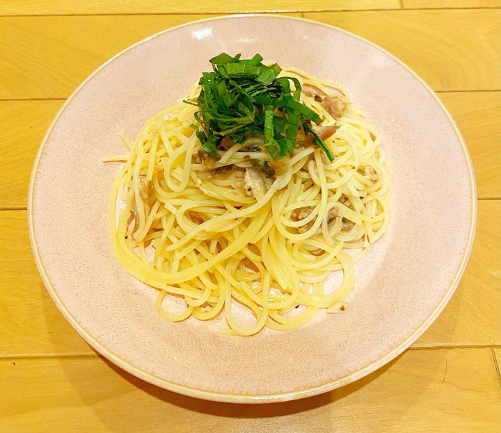 茹でたパスタに「さばで健康」を混ぜ合わせ、刻んだ大葉を乗せるだけです!