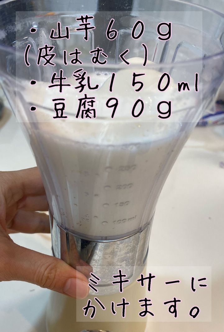 1.山芋は一口大くらいに切り、豆腐、牛乳と一緒にミキサーにかけます。