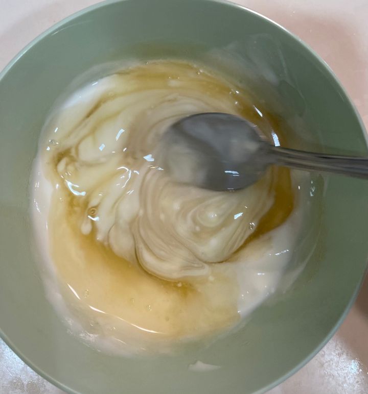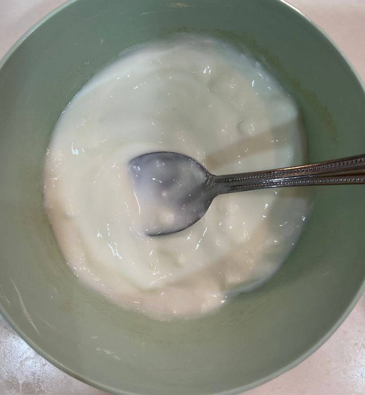プレーンヨーグルトを大さじ3くらいお皿に移し、滑らかになるまで混ぜる。