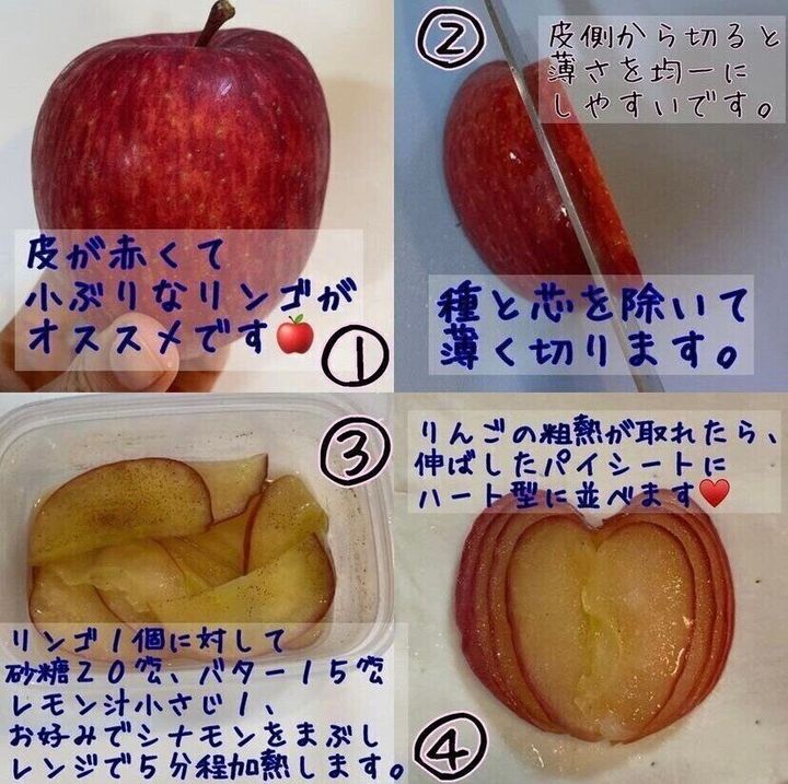 3. パイシートを4等分して、真ん中にりんごをハート型になるように並べます。