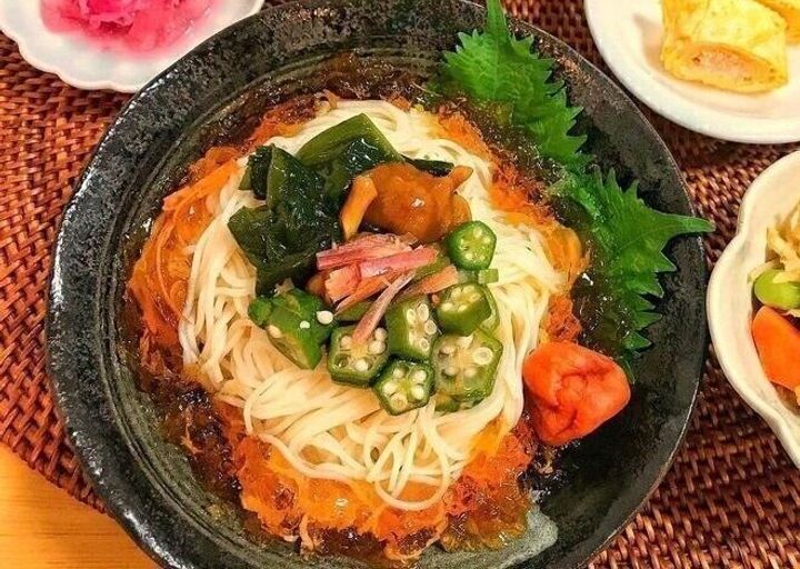 食欲のない日でも食べやすい素麺にトッピングをプラスしました。おつゆはジュレ状にして、麺に絡みやすくしています。