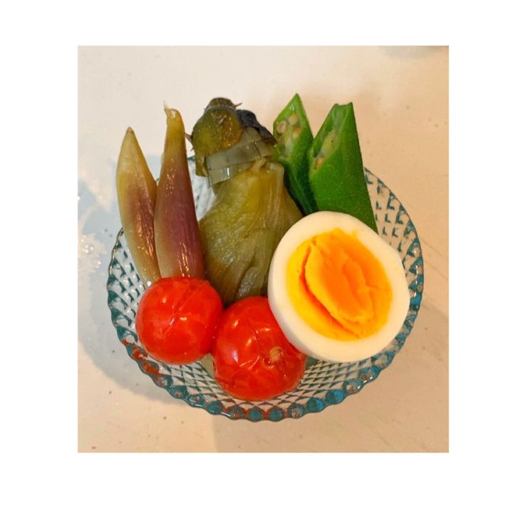 オクラとみょうがは火を止める2分ほど前、トマトと茹で卵は火を止めてから入れます。