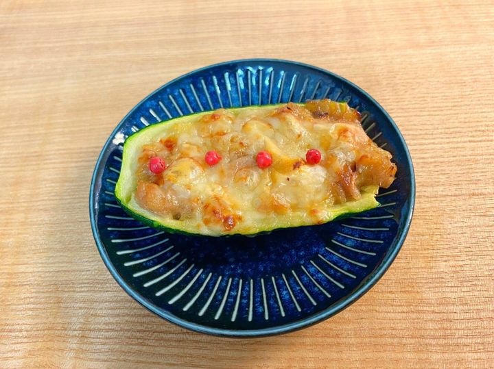 (4)(1)のズッキーニの皮部分に(3)を詰め、ピザ用チーズを乗せます。