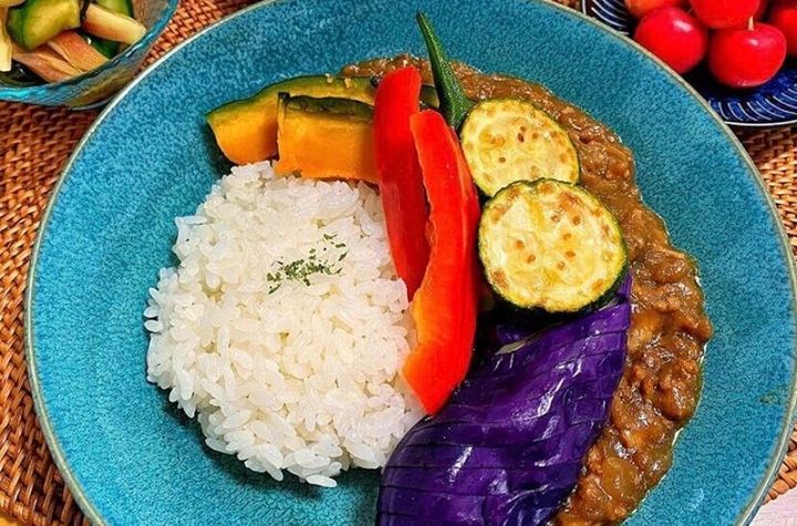 写真だと少し分かりづらいですが、こちらのカレーには5.レンジ加熱+ラップをとって冷ました濃い色の茄子を使用しています。