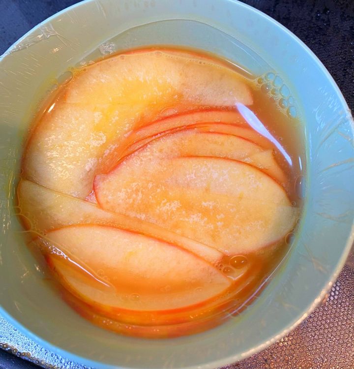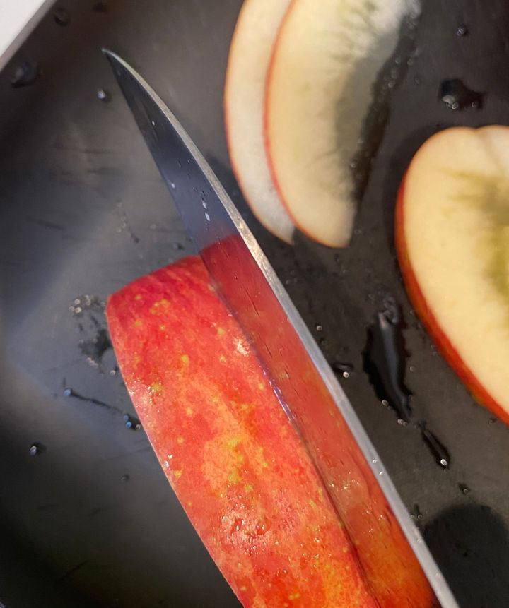2.りんごは4等分に切って芯をとり、5mmくらいの厚さに切ります。