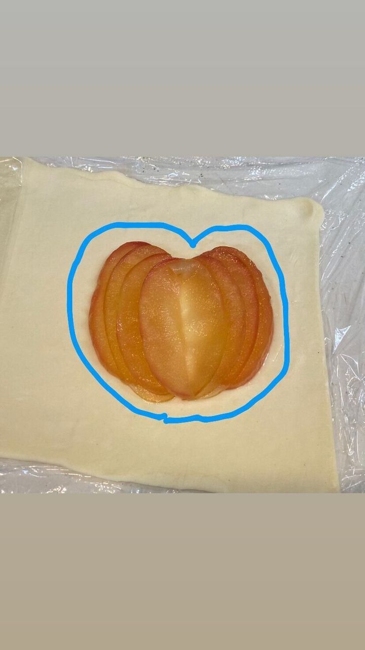 4.パイシートに3のりんごを並べ、爪楊枝で一回り大きなりんご型に印をつけます。