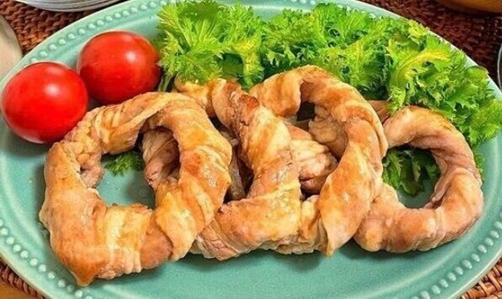 ※お肉の長さが足りない時は継ぎ足しながら、中の玉ねぎが見えないように巻きます。