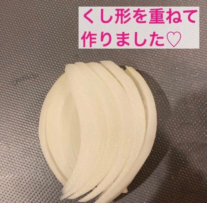 1.新玉ねぎは1.5㎝幅の輪切りにする。二重のリング状を8個作る。