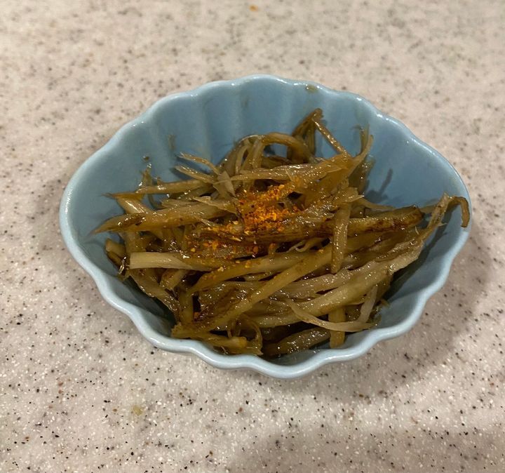 細く切ったごぼう1本をごまあぶらで軽く炒めて