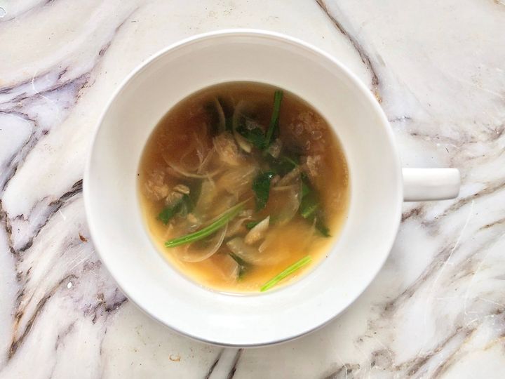 この日は、オニオンのレトルトスープには野菜と玉ねぎをプラス。野菜を蒸しても良し、炒めても美味しいです。また、肉や魚を足せば、立派なおかずに。ご飯やパンにレトルトスープだけだと栄養が偏ってしまうので、少し栄養をプラスしてワンランクアップのスープにすれば、代謝もアップに!朝ごはんに野菜を炒めるのが面倒、作りおきがない!なんて時におすすめです。