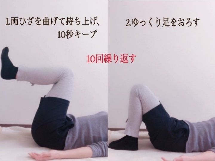 (1)両手を体の横に置き、両ひざを曲げて持ち上げ10秒キープしましょう。