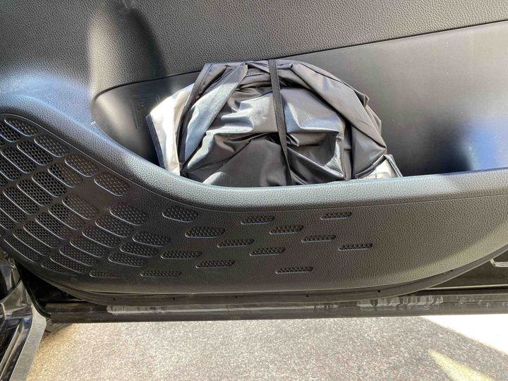 今回のサンシェードは、運転席側のドアポケットを収納場所にしました。助手席側だと同乗者がいないと取り出しにくいので、車を運転する時に必ず乗る運転席側に収納場所を作りました。