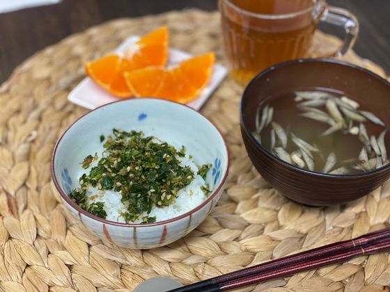 この日は大根の葉で作ったふりかけに、ゴボウのスープ、デザートには甘平を食べました。