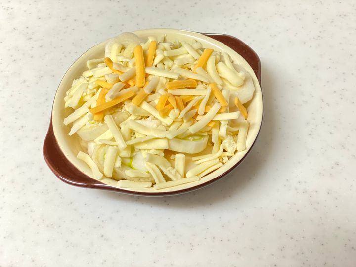 耐熱皿に材料をいれて、合わせ調味料とチーズをたーっぷりかけて焼くだけでOK!これだけで1品が完成しますよ。