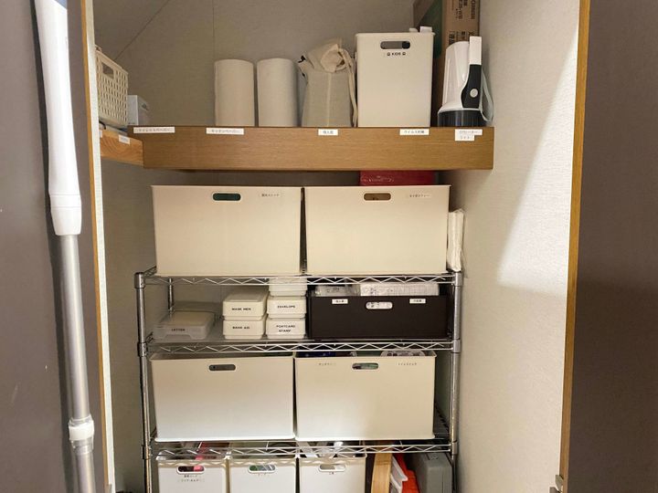 収納棚自体を、通気性の良いスチールラックに替えました。ジャンル・使用頻度に合わせて収納を変えたので、ストック管理も楽になりました。紙製品の在庫も一目瞭然です!
