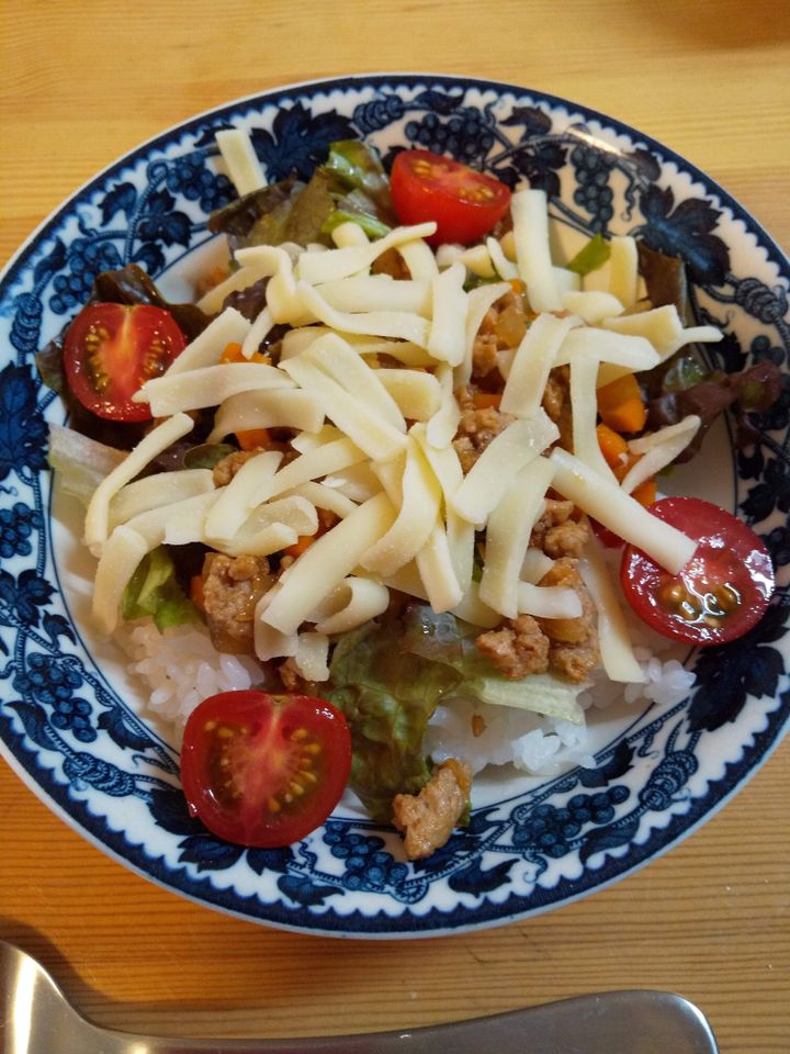 挽肉と残り野菜をケチャップと醤油とソースで炒め、ご飯、ケチャップ、レタス、挽肉、ミニトマト、チーズだけです。
