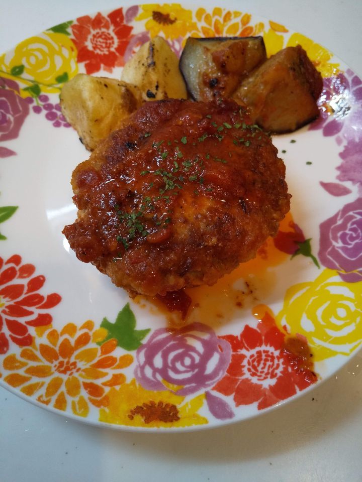 表裏焼き色がつくまで焼いて、トマト缶、コンソメ、砂糖、醤油、ソース、ケチャップ、酒で煮込むだけです。我が家はハンバーグにニンニクを入れるのでこの味付けですが、ニンニクを入れると味に深みが出ます。ナスも一緒に煮込むと美味しいですよ。