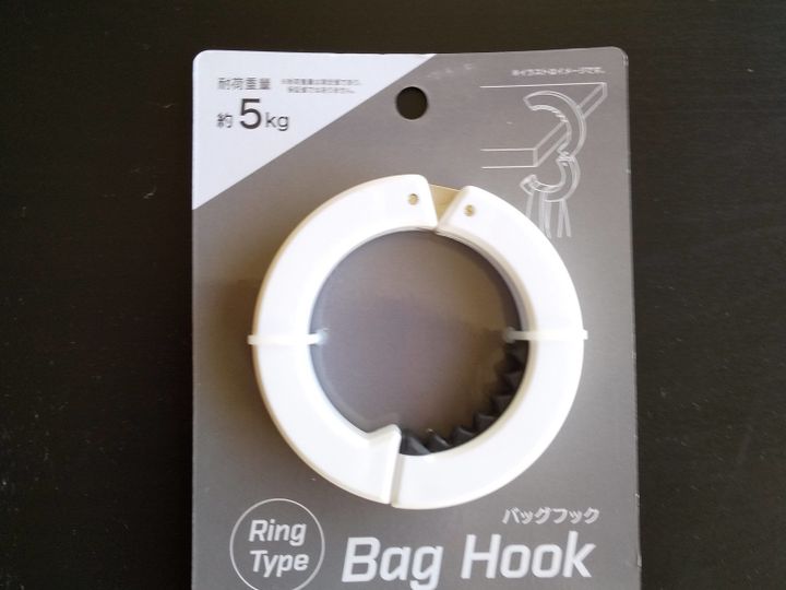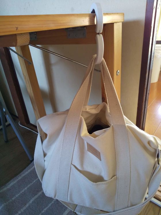 休憩の時も、ビニールバッグの取っ手につけて、テーブルにかけてみました。