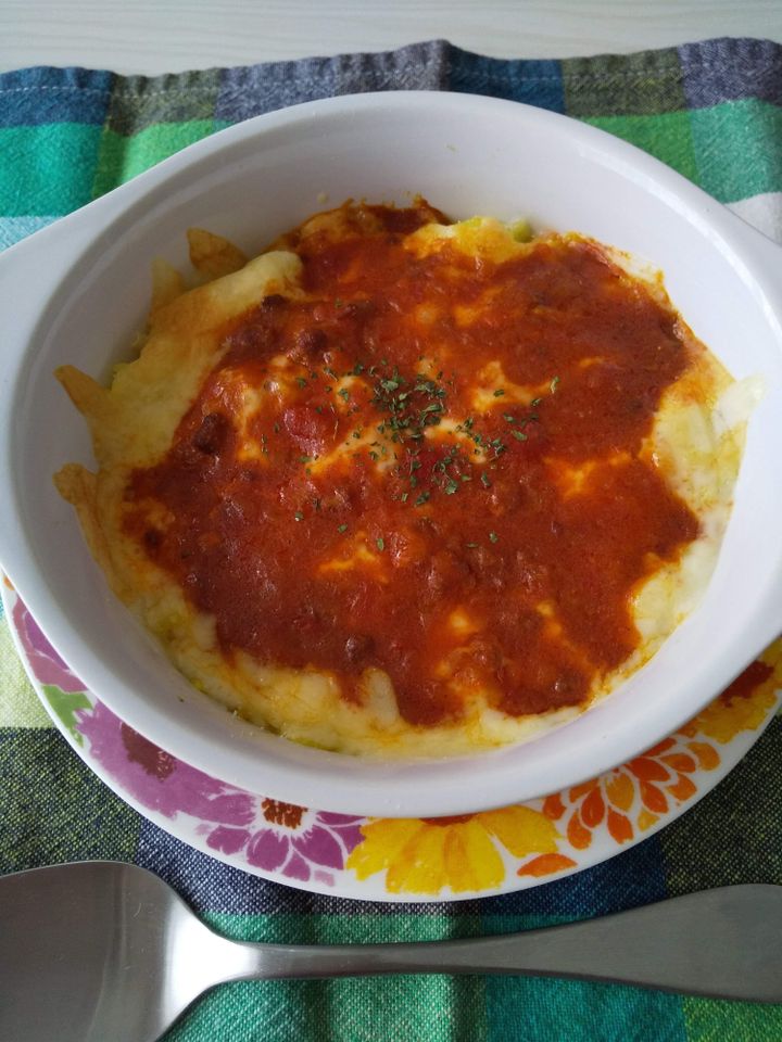 ターメリックライス(炊飯器にターメリックを入れて炊いただけ)チーズをのせ、最後にこのミートソースをかけ、オーブンで焼きました。