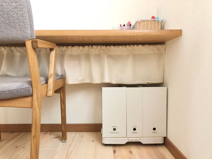 スタディーコーナーのワークスペースを有効活用したいこと以外にも、次女の背丈がまだ小さくボックスの目線が届かないことから、足元を収納場所にしたことは結果とっても良かったです。