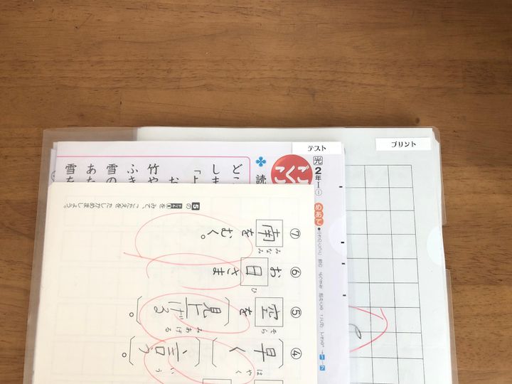 学校から帰宅したら、テストやプリントのチェックをしたのち、子供たち自身でクリアファイルに分類して仕舞います。