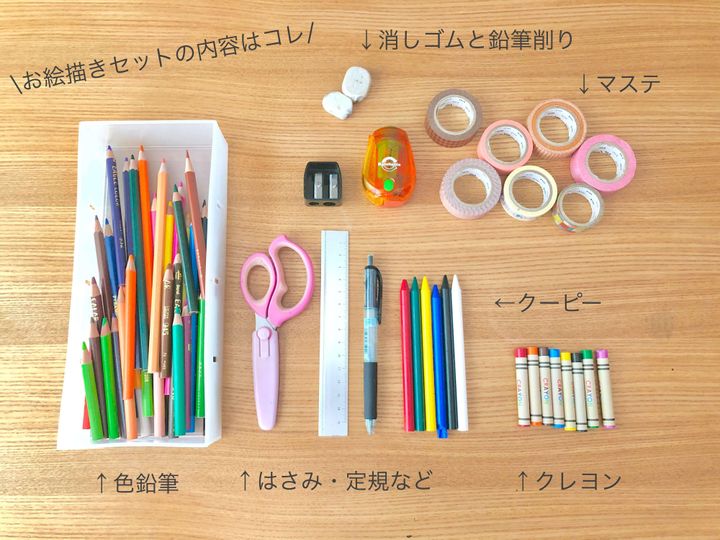 色鉛筆、クレヨン、マーカー、消しゴムに鉛筆削り、ハサミやマステ・・・本当に細かいものがたくさん!
