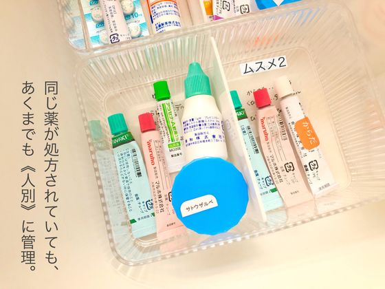人によって、処方されている薬がバラバラなため、毎日のスキンケアセットは人別管理にしています。なおかつ、部位によって塗布する薬も異なるため、とても覚えきれず、その都度ラベリングして管理しています。