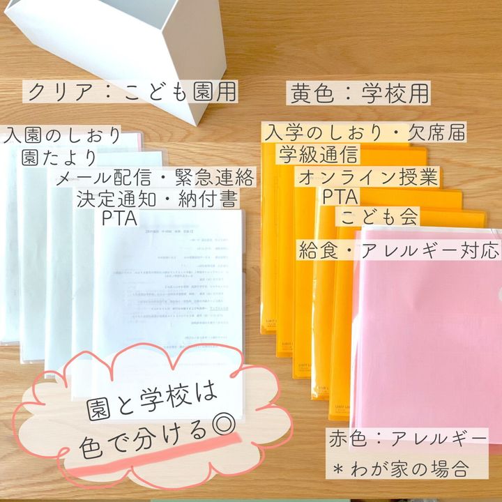 カラー別にファイルを使うと『幼稚園用』と『学校用』をひと目で見分けられます◎