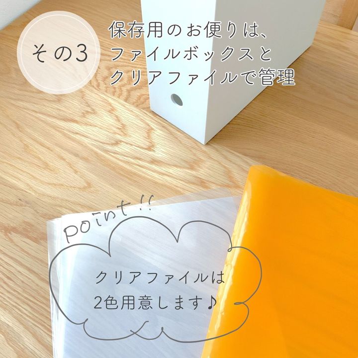 カラー別のクリアファイルをそれぞれに必要な項目でラベリングしておけば、カンタンにお便り管理ができますよ。