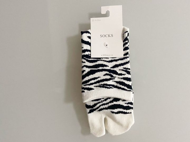 「アニマル柄足袋ソックス」(330円)はゼブラ柄の他に牛柄の2柄展開で発売中。スニーカーからちらっと見せるとコーディネートのアクセントになっておしゃれ! アニマル柄ですが、カラーがホワイトとブラックで柄が描かれているので、ファッションに取り入れやすいですよ。