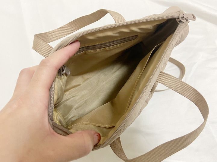 「エンボスキルト ショルダー」は容量が約2L。小さいバッグかなぁと思いきや、マチがあるので荷物がしっかり入ります。2つ折り財布・スマートフォン・ハンカチ・お直し用のメイク用品などを入れてもまだ余裕がある感じ。