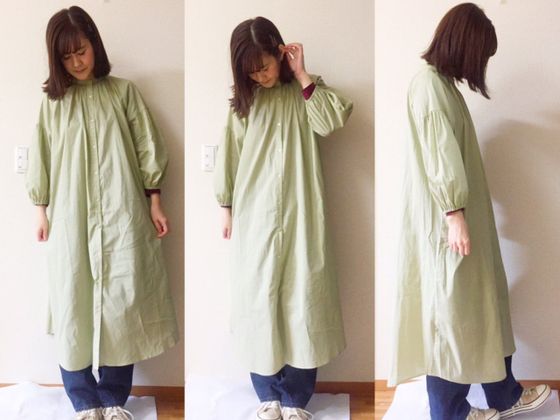 今回紹介したバンドカラーギャザーワンピース(7分袖)は羽織としても使えるので、