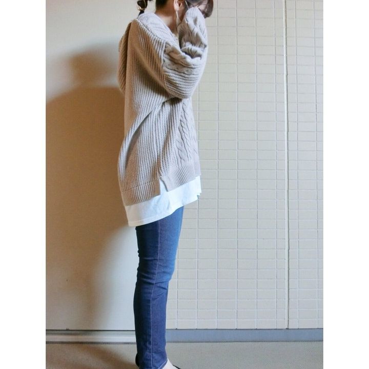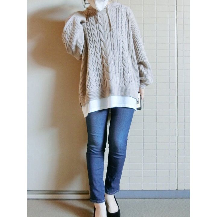 デザインも縦長に見える編み方なので、実際の体重よりも細く見えます。