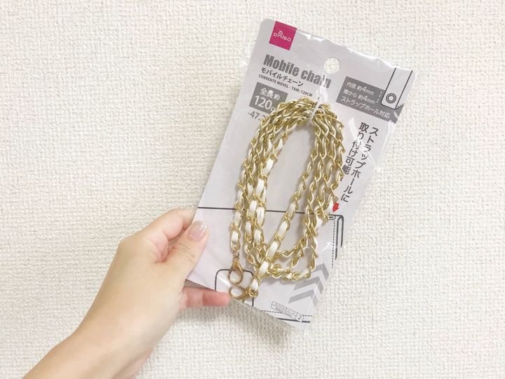 DAISOではホワイト×ゴールド以外にピンク×ゴールドのモバイルチェーンも発売されています。