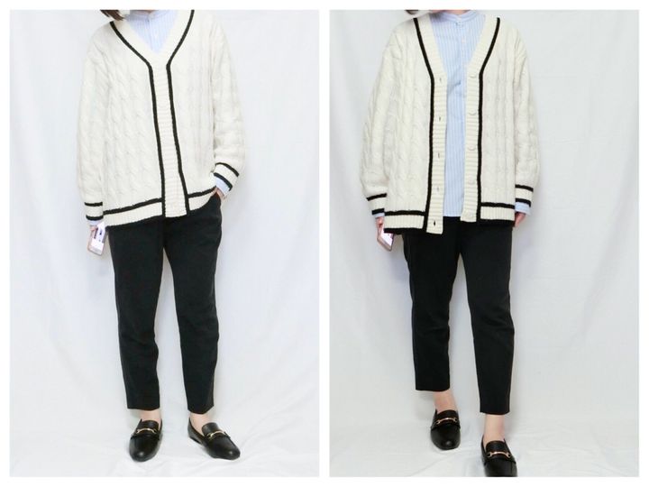 先ほどのコーディネートと全く同じ組み合わせですが、カーディガンのボタンを開けて羽織ればカジュアルな印象が強いコーディネートに変身します。