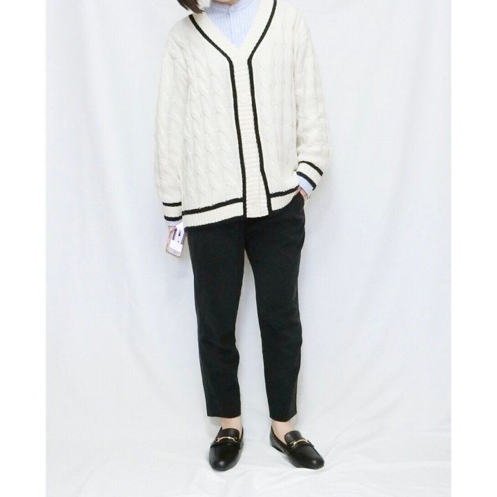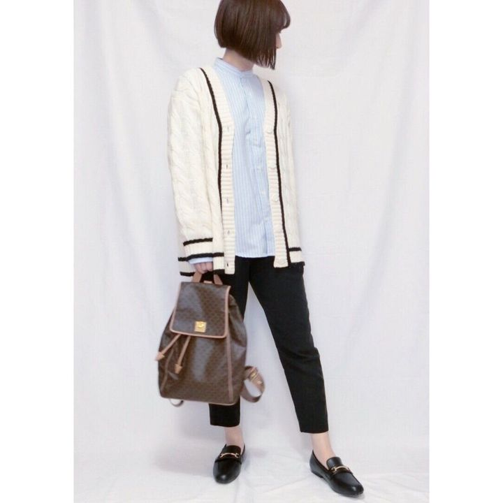 マニッシュなコーディネートを楽しみたいなら、カーディガンのボタンを閉めて着こなすのがおすすめ。
