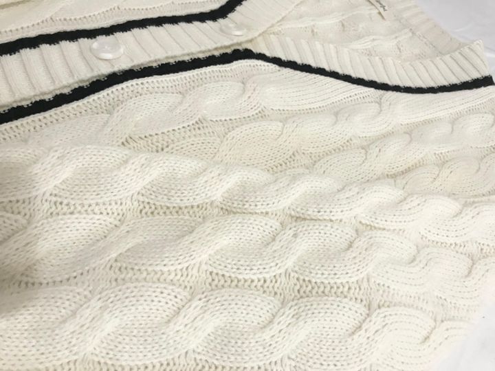 プチプラのあやさんとしまむらのコラボブランド「dearful」の新作「DFチルデンニットCD」(1969円)。カラー展開は、筆者が購入したホワイトとグレーの2色展開です。
