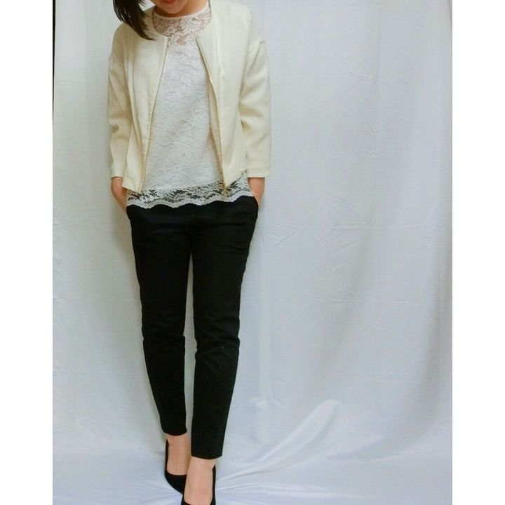 レースブラウスは少し露出が多いように感じますが、ジャケットを羽織れば露出も押さえつつ、華やかさをプラスしたセレモニースタイルに。